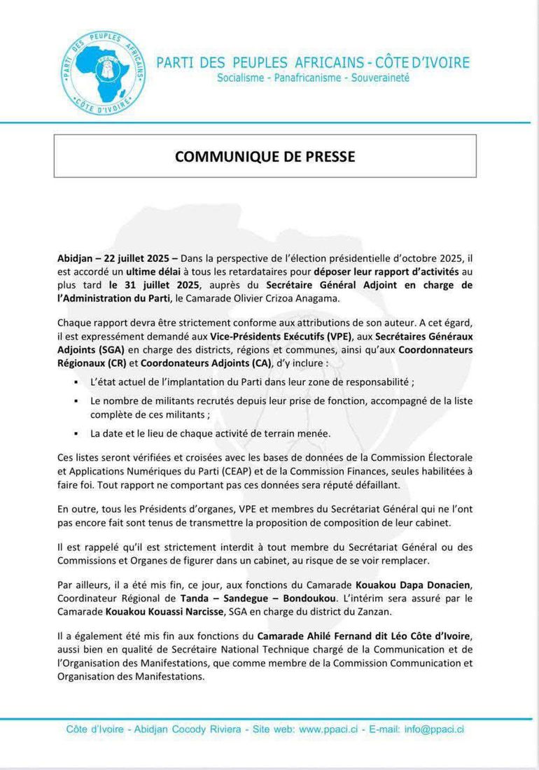 Dans un communiqué en date du 22 juillet 2025, signé par Me Habiba Touré, porte-parole de Laurent Gbagbo, elle annonce la fin des fonctions de Kouakou Dapa Donacien, coordinateur régional de Tanda, Sandegue, Bondoukou. L'intérim sera assuré par Kouakou Kouassi Narcisse, SGA en charge du district du Zanzan. Il a été également mis fin à la fonction de Ahilé Fernand en qualité de Secrétaire National Technique chargé de la communication et de l'organisation des manifestations, tout comme membre de ladite commission.