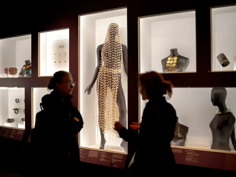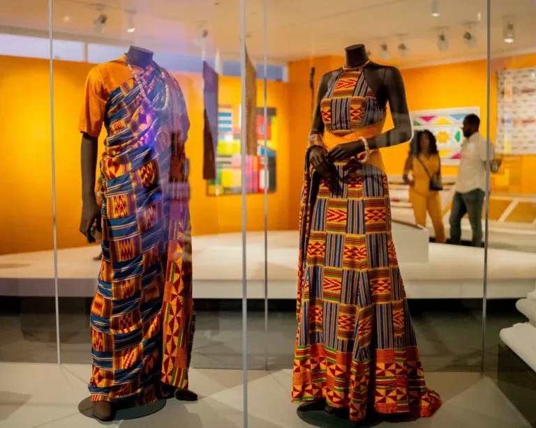 ancestrales et avant-gardes contemporaines, un parcours captivant qui retrace l'exposition dans la Galerie Jardin. Les visiteurs découvrent des textiles historiques comme le kente ghanéen, le bògòlanfini malien ou l' aṣọ-òkè nigérian, bijoux, accessoires et photographies, en dialogue avec des pièces signatures de créateurs actuels tels que Thebe Magugu (Afrique du Sud) ou Artsi Ifrach pour Maison ArtC. Des motifs géométriques en noir et ou aux robes volantes aux couleurs vives, chaque installation évoque une Afrique inventive, porteuse de messages spirituels et politiques.