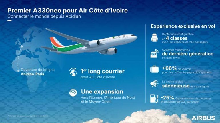 Ce nouvel appareil, le premier d'une série de deux, est le fruit d'un partenariat stratégique entre le gouvernement ivoirien, la Banque Ouest Africaine de Développement (BOAD) et d'autres partenaires financiers. Avec une capacité de 242 sièges répartis sur quatre classes First, Business, Premium Économique et Économique l'A330-900neo d'Air Côte d'Ivoire se distingue par son confort et sa modernité.
