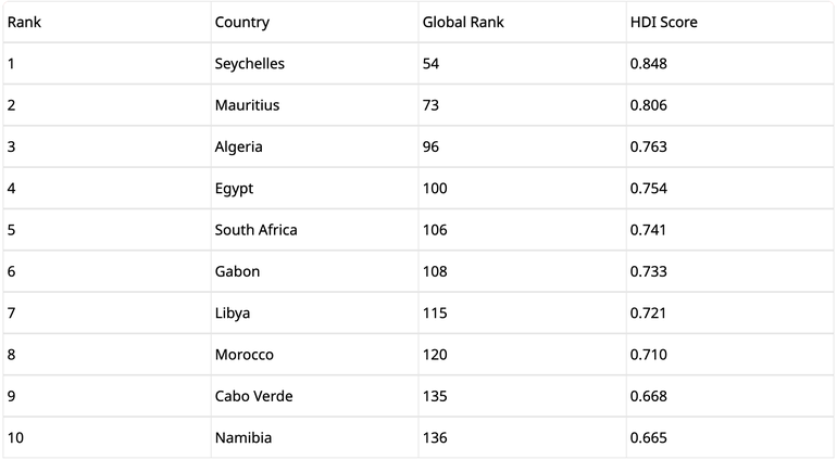Les pays d'Afrique du Nord, en particulier l'Algérie, l'Égypte et le Maroc, occupent également une place importante dans le classement, grâce à l'amélioration des infrastructures, de la santé publique et du développement du capital humain. En Afrique australe, l'Afrique du Sud et la Namibie se distinguent par leurs progrès, même si les inégalités persistantes continuent de freiner leur avancée globale.