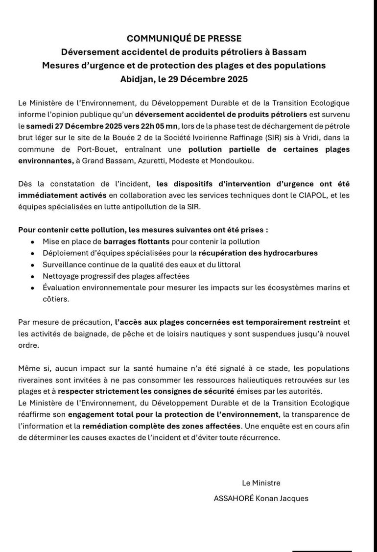 L’incident s’est produit le samedi 27 décembre 2025 aux environs de 22h05, lors d’une phase de test de déchargement. Sous l’effet des courants marins, la nappe d’hydrocarbures a dérivé vers l’est, affectant directement les plages de Gbamelé, Azuretti, Modeste et Mondoukou.