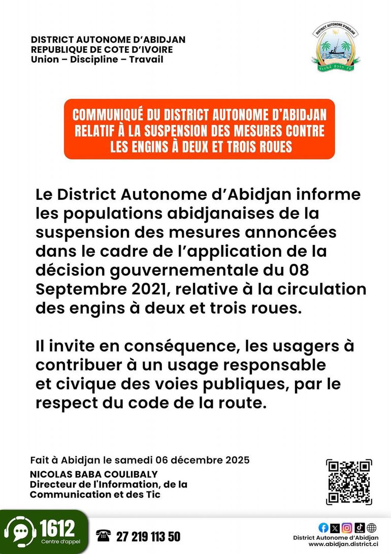 C’est un véritable retournement de situation. Alors que l’interdiction de circulation des engins à deux et trois roues faisait polémique depuis plusieurs jours, le District Autonome d’Abidjan vient de publier un communiqué annonçant la suspension officielle des mesures issues de la décision du Conseil des ministres du 08 septembre 2021.