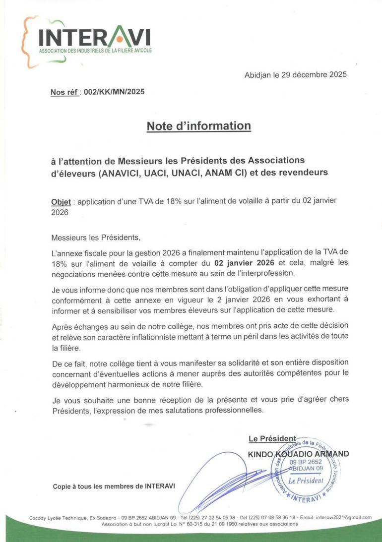 L’information a été officiellement confirmée par l’Association des Industriels de la Filière Avicole (INTERAVI) dans une note datée du 29 décembre 2025, adressée aux présidents des associations d’éleveurs (ANAVICI, UACI, UNACI, ANAM-CI) ainsi qu’aux revendeurs.