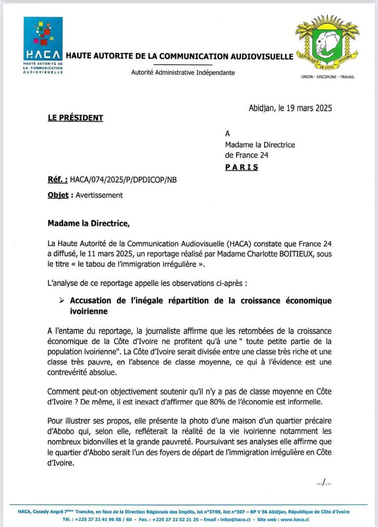 Face à ces manquements, la HACA a décidé de mettre en garde France 24, l’invitant à faire preuve de plus de prudence et de professionnalisme dans sa couverture de l’actualité ivoirienne..