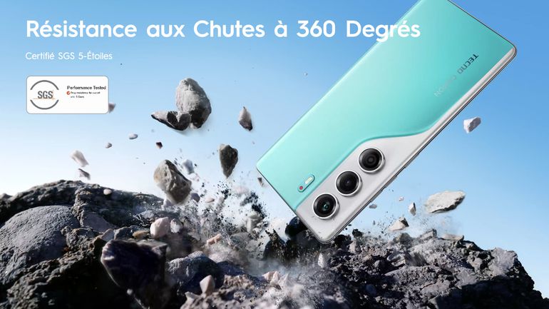 TECNO CAMON 40, résistance structurelle globale du téléphone mobile améliorée de 20 %. Il supporte les chutes, ce qui prolonge ainsi sa durée de vie.