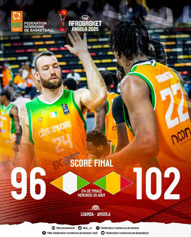 Pour l'Afrobasket 2025 en Angola, les Aigles du Mali ont créé la surprise en éliminant la Côte d'Ivoire, 31e nation mondiale, après un match palpitant qui s'est conclu sur un score de 102-96, suite à une prolongation (12-6). La rencontre, disputée le mercredi 20 août, a permis aux Maliens de se qualifier pour la demi-finale du Championnat d'Afrique des Nations, qui se déroulera samedi 23 août. La Côte d'Ivoire est tombée en quart de finale.