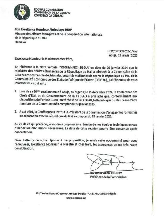 Dans une correspondance datée du lundi 13 janvier 2025, le Président de la Commission de la CEDEAO, Dr. Alieu Touray, a répondu à la décision du Mali de quitter la Communauté Économique des États de l’Afrique de l’Ouest (CEDEAO). Cette lettre, adressée au ministre malien des Affaires étrangères, marque une étape décisive dans la mise en œuvre des formalités de séparation entre le Mali et l’organisation régionale.