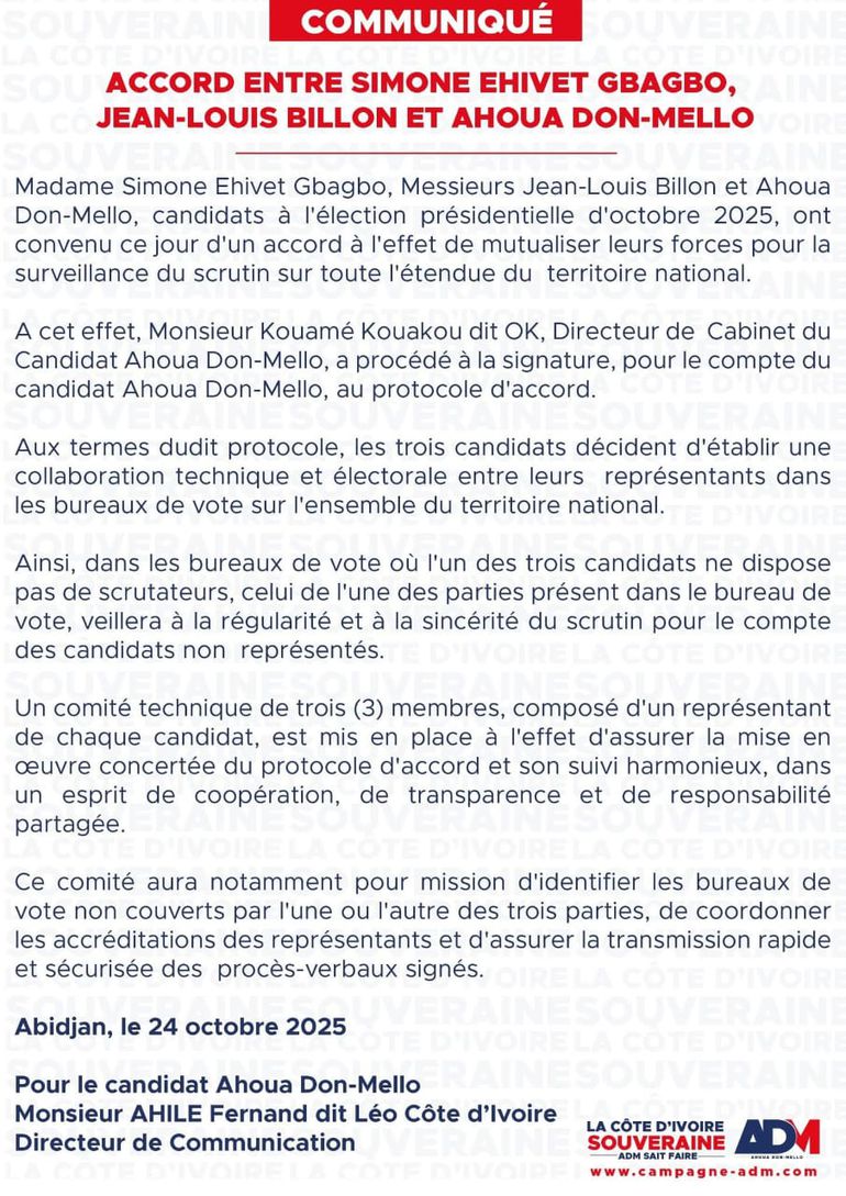 À la veille de l’élection présidentielle prévue pour le 25 octobre 2025, trois figures de l’opposition ivoirienne Simone Ehivet Gbagbo, Jean-Louis Billon et Ahoua Don-Mello ont annoncé la signature d’un accord technique de coopération électorale. Cette alliance vise à mutualiser leurs forces pour assurer une surveillance rigoureuse du scrutin sur l’ensemble du territoire national.