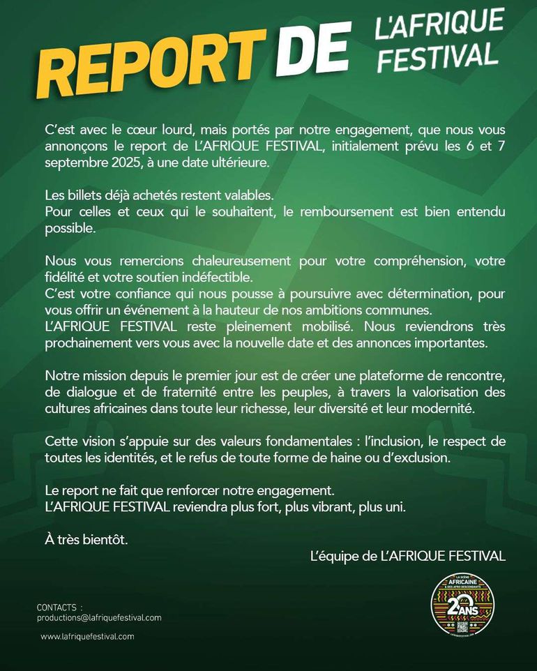 À la suite de ces propos, Roseline Layo a été déprogrammée de la 20ᵉ édition de l’Africa Festival, prévue au Parc des Princes à Paris. L’événement a été reporté à une date ultérieure, annonce faite officiellement sur la page de l’Africa Festival.