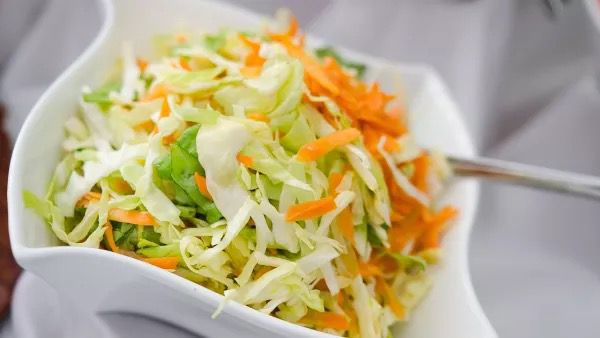 Une salade croquante de chou et carottes, agrémentée de mayonnaise, de moutarde et d’un soupçon de vinaigre, pour une entrée légère et savoureuse. Le tout accompagné de pains croustillants.