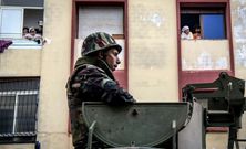 Le président sud-africain Cyril Ramaphosa avec les soldats qui ont été déployés à partir d'une base militaire dans le township de Soweto.