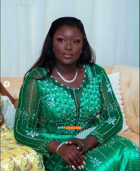 Pour sa première tenue, la propriétaire de "Linguère beauty" a opté pour une belle robe blanche accompagnée de perle en cristal assortie avec des bijoux en or qui scintillent de partout.