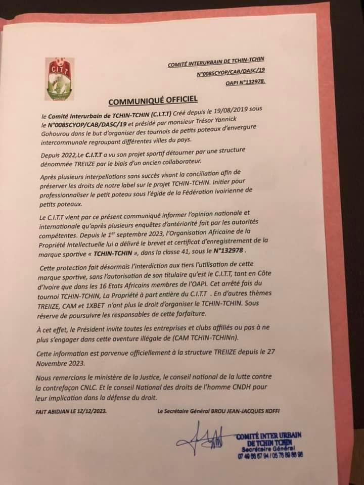 En dépit de négociations infructueuses avec Jonathan Morrison, le CITT a pris des mesures judiciaires, aboutissant à cette décision. Par conséquent, la réalisation de la 3ème édition du Cam Tchin-Tchin est maintenant compromise. Pour l'heure, Jonathan Morrison et l'équipe de Treiize n'ont pas encore réagit face à ces assertions.