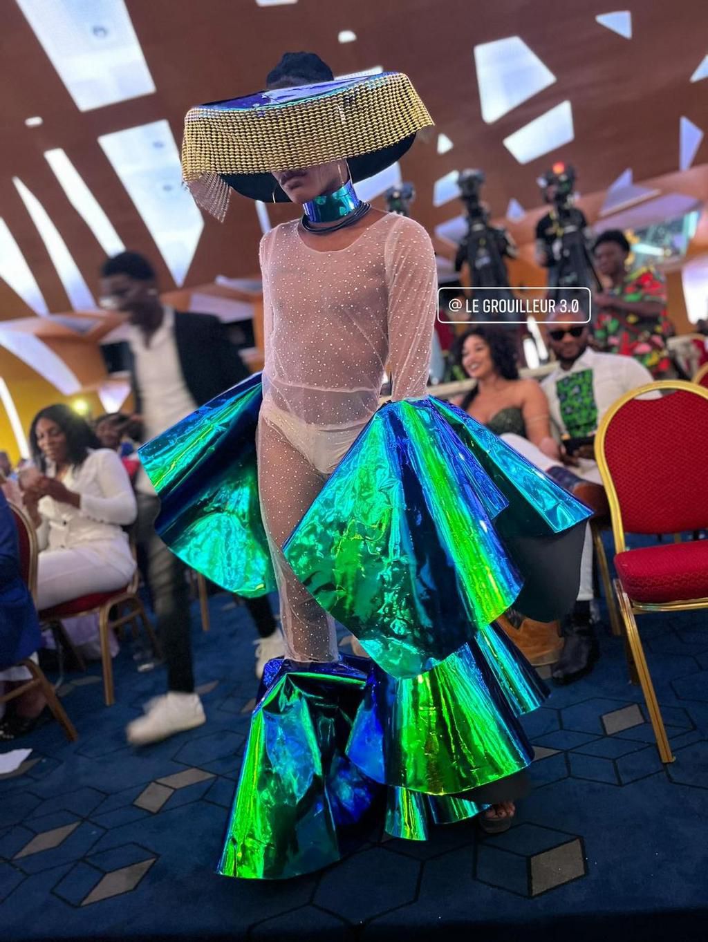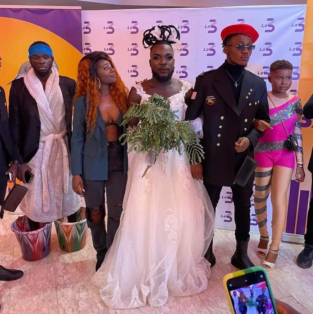 Un mariage au PRIMUD ? Le chanteur a porté une robe de mariée, une coiffe Akan et un bouquet de feuilles.