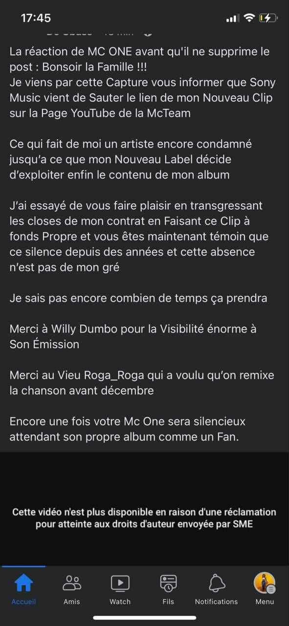 Pourtant, il a décidé de faire le clip de cette chanson à ses propres frais et de le poster sur son compte YouTube MC One team. Peu de temps après, la vidéo a été supprimée par Sony Music. C'est ainsi que dans un post sur son compte Facebook, il a exprimé son désarroi. Selon lui, par cette suppression, il devient un artiste condamné à suivre la stratégie de son label. Il a décidé de transgresser les règles de son contrat, mais retour à la réalité. Ce post a d'ailleurs été supprimé des minutes après la publication.