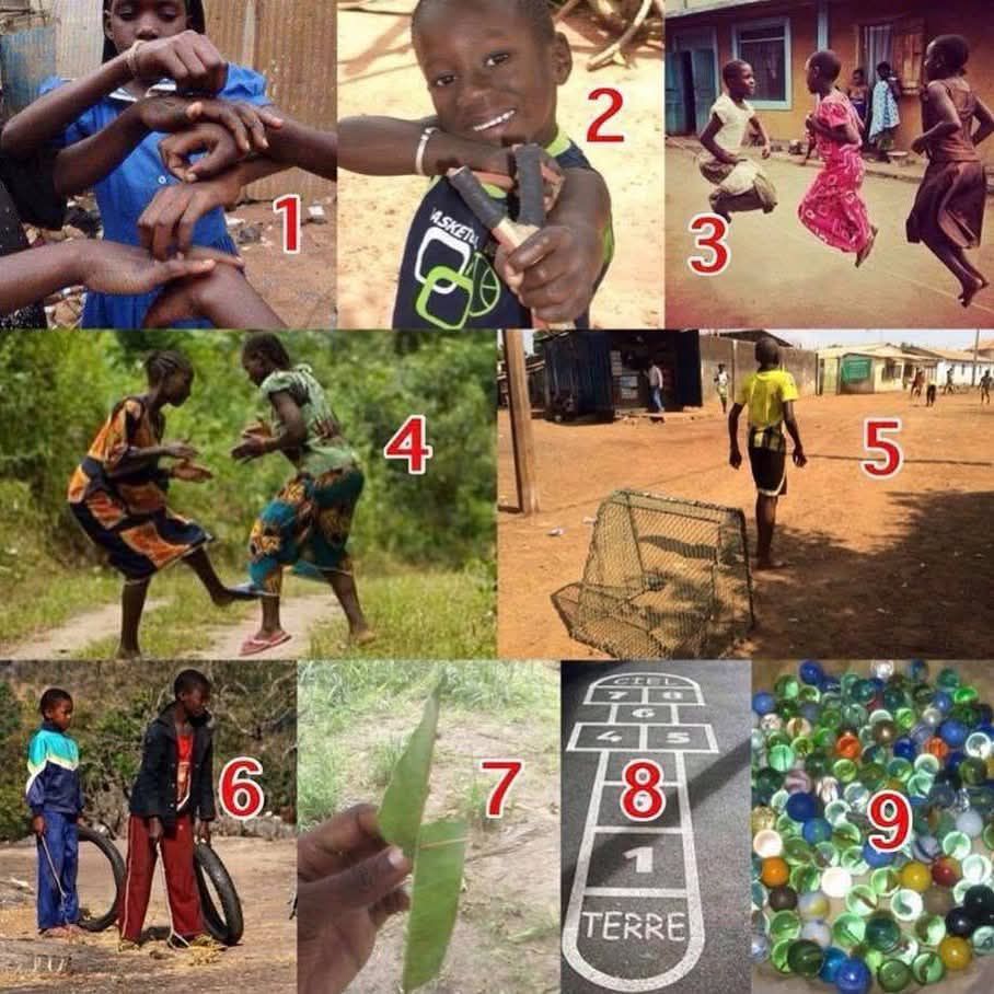 L’enfance africaine excellait à transformer l’environnement en terrain de jeu. Une boîte en carton pouvait devenir une voiture ou une maison, un bâton une épée magique, une herbe une poupée et construire des cabanes avec des branches ou des feuilles stimulait la créativité et le travail en équipe.