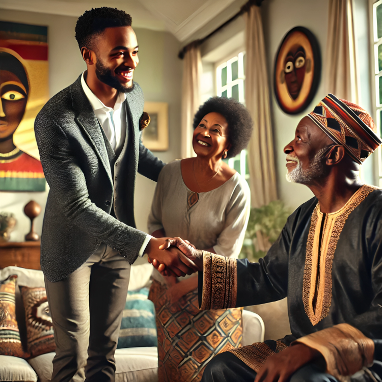 Un Africain d’une trentaine d’années, chaleureusement accueilli par sa belle-famille dans un salon joliment décoré.