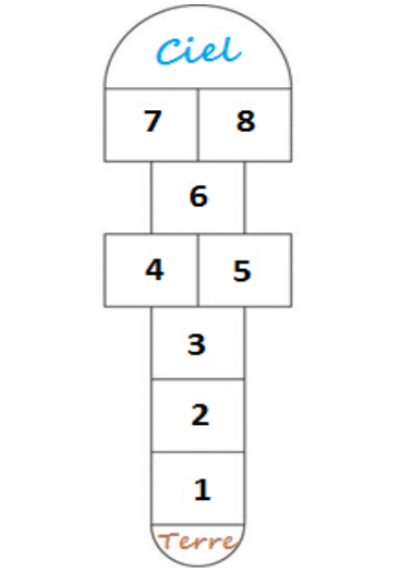 La marelle est le jeu d’extérieur pour apprendre à compter et à garder l’équilibre. C’est un jeu très ancien, massivement pratiqué au Moyen Âge. Pour jouer à la marelle, il vous faut une craie pour tracer le dessin ou un bâton si vous jouez dans le sable et un caillou par joueur. Pour commencer, chaque joueur se place sur la case « terre ». Le premier joueur doit lancer le caillou dans la case 1. Si le lancer est réussi, il peut alors débuter le parcours. Pour ce faire, il doit sauter à cloche pied par-dessus la case 1 pour atterrir dans la case 2. Ensuite, il faut passer à cloche pied dans les cases 2 et 3. Quand le joueur arrive aux cases doubles, il doit poser un pied dans chaque case et ce en même temps. Pour le 6, il repart à cloche pied et pour les cases 7 et 8 il répète la même opération que pour les 4 et 5. Une fois sur les cases 7 et 8 le parcours aller est terminé, le joueur doit sauter et faire volte-face pour entamer le retour. Le retour se fait selon le même procédé expliqué au-dessus, jusqu’à la case 2. Arrivé ici, le joueur doit se pencher sur une jambe et ramasser son caillou situé sur la case 1. Il saute alors par-dessus la case 1 et reviens donc à sa position de départ (case « terre »).