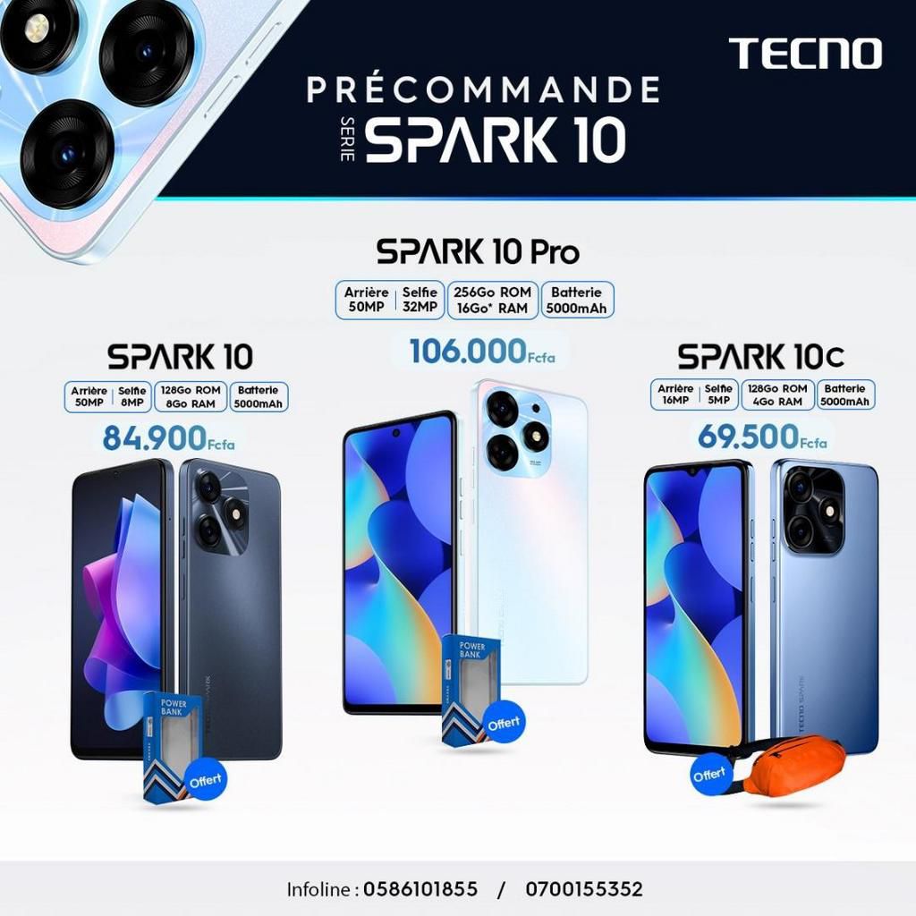 - SPARK 10 : 128Go ROM + 8Go RAM au prix de 84.900 FCFA