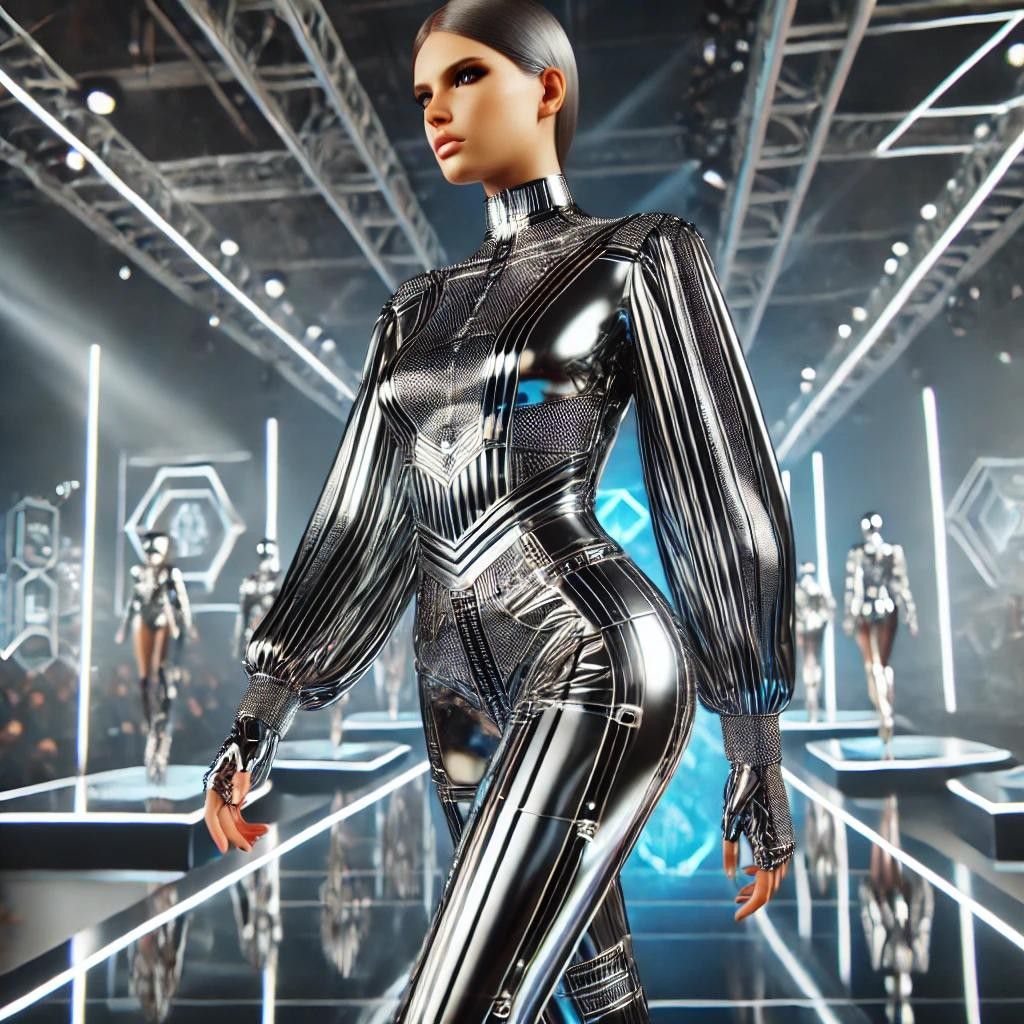 Inspirée des tenues de science-fiction, la combinaison métallique est une déclaration de style audacieuse. Les tissus réfléchissants et les détails géométriques rappellent l’univers de l’IA, tout en étant élégants et glamour. C’est une tenue parfaite pour un événement où la technologie est mise à l'honneur.