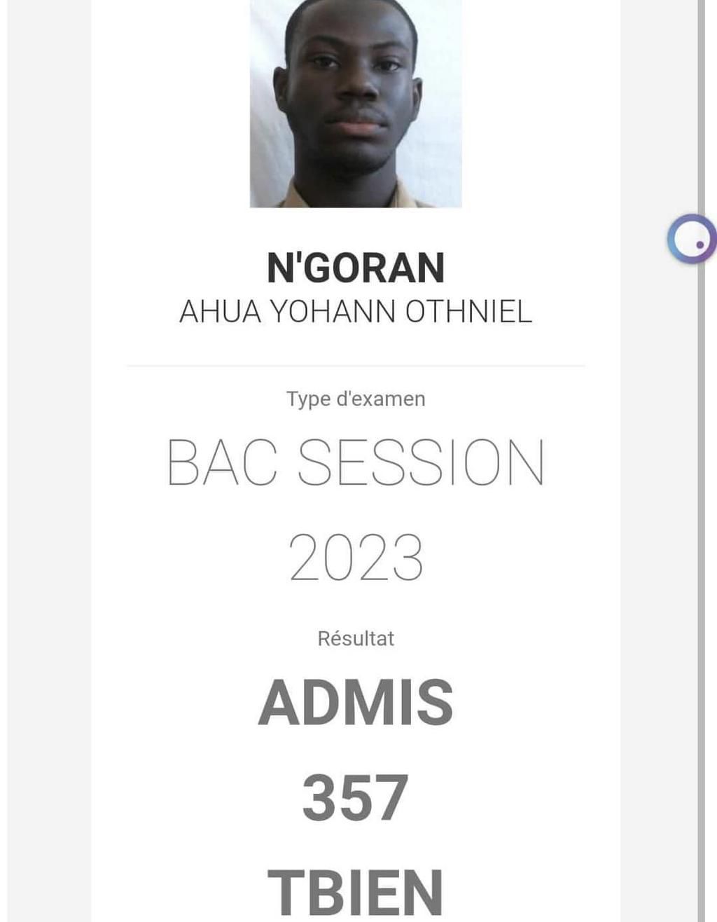 Les résultats au Bac de Othniel Yohann Ahua N’GORAN
