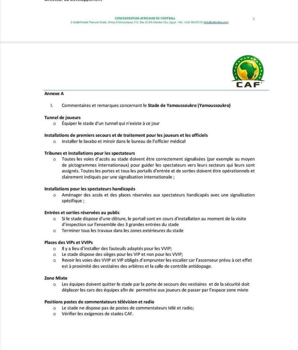 Document de la CAF sur l'homologation temporaire du stade de Yamoussoukro/CAF