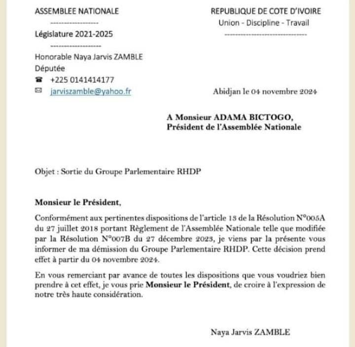 Madame Zamblé fonde sa démission sur la Résolution N°005A du 27 juillet 2018, modifiée par la Résolution N°007B du 27 décembre 2023. Cette règle, bien connue des juristes parlementaires, autorise les députés à se retirer d'un groupe parlementaire en envoyant une notification formelle.